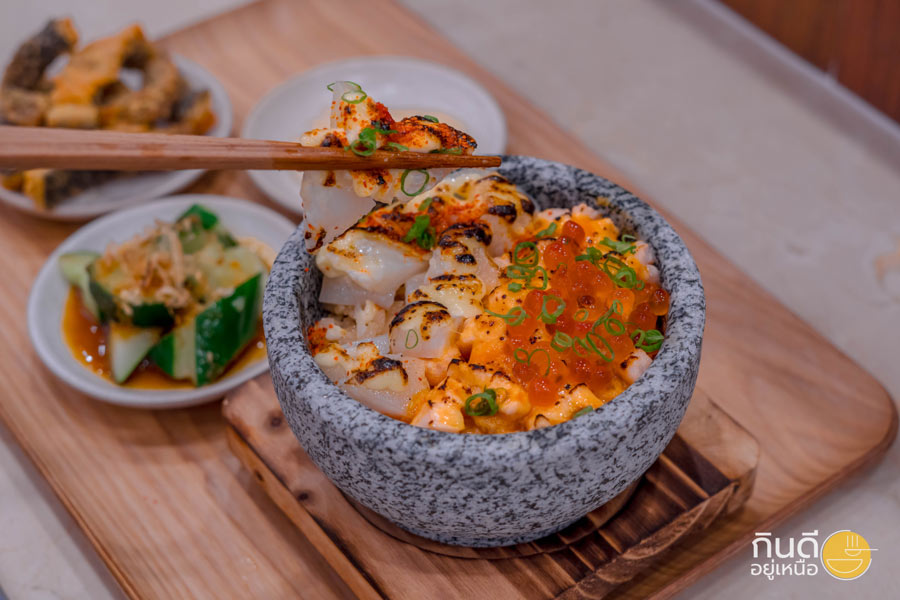 อีกเมนูที่ไม่สั่งไม่ได้ มินิภูเขาไฟ ข้าวหน้าปลาดิบรวม เหมาะกับคนที่อยากลองหลายรสในคำเดียว ปลาดิบหลากชนิด ซอสเข้มข้น กินแล้วได้ทั้งความสด ความกรอบ และรสอูมามิเต็มคำ