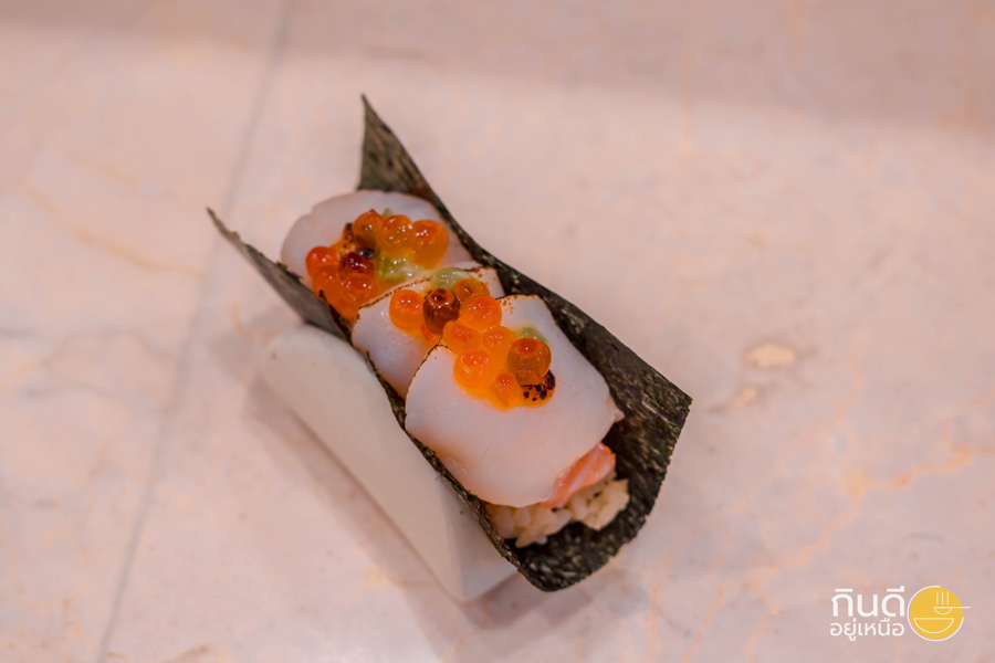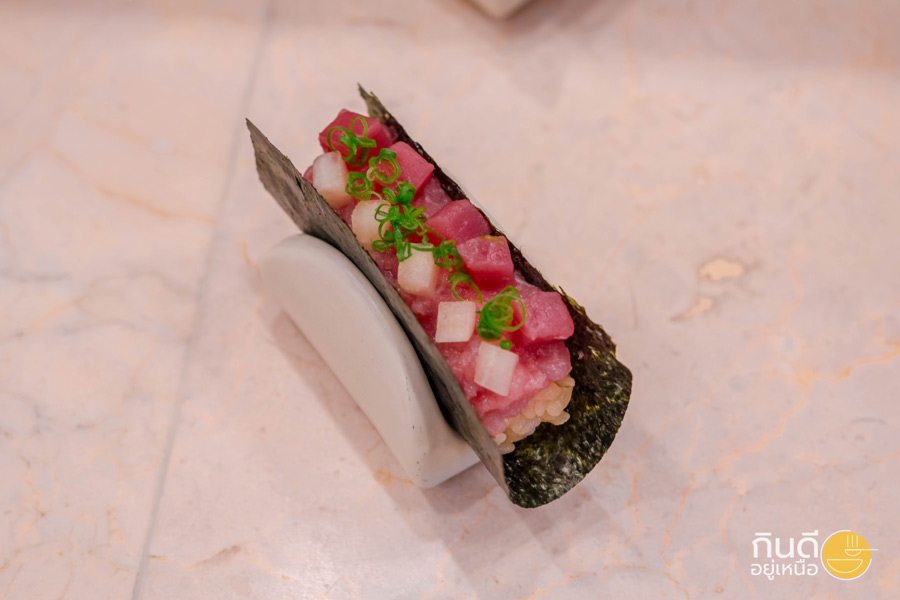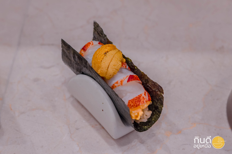 ต่อด้วยส่วนของไฮไลท์ Hand Roll Sushi 5 คำ แบบฟินๆ คำแรกเป็น Cho Hand Roll เมนูซิกเนเจอร์ที่รวมวัตถุดิบระดับพรีเมียมไว้ในคำเดียว ทั้งสด ทั้งหอม ทั้งกรอบ ใครมาก็ต้องเริ่มจากเมนูนี้ก่อนเลย