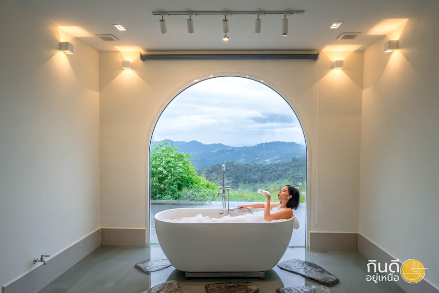 นอกจากผิวน้ำด้านนอกแล้ว ยังมีโซนห้องน้ำขนาดใหญ่ พร้อมอ่างอาบน้ำและกระจกใสบานโต ที่สามารถมองวิวภูเขาและวิวหมอกได้แบบดีงามสุดๆ ไปเลย เรียกได้ว่าแค่ห้องน้ำก็ใหญ่เท่าห้องนอนแล้ว