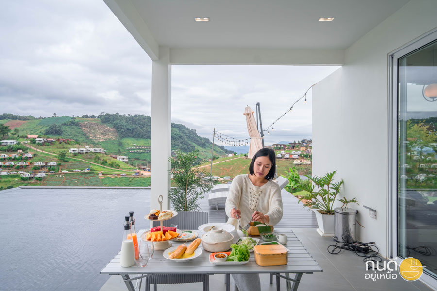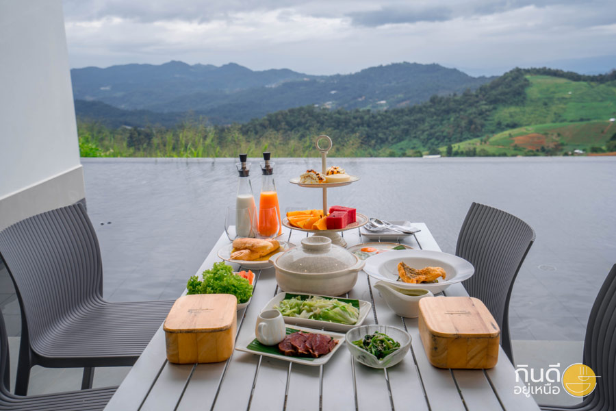 ส่วนอาหารเช้าก็เสิร์ฟเป็น อาหารฟิวชั่นสุดพิเศษ ผสมผสานเอกลักษณ์ของอาหารเหนือโดยใช้วัตถุดิบท้องถิ่นจากชาวบ้าน สดใหม่ทุกเช้า จัดจานมาแบบสวยลัคชัวรี่มากๆ