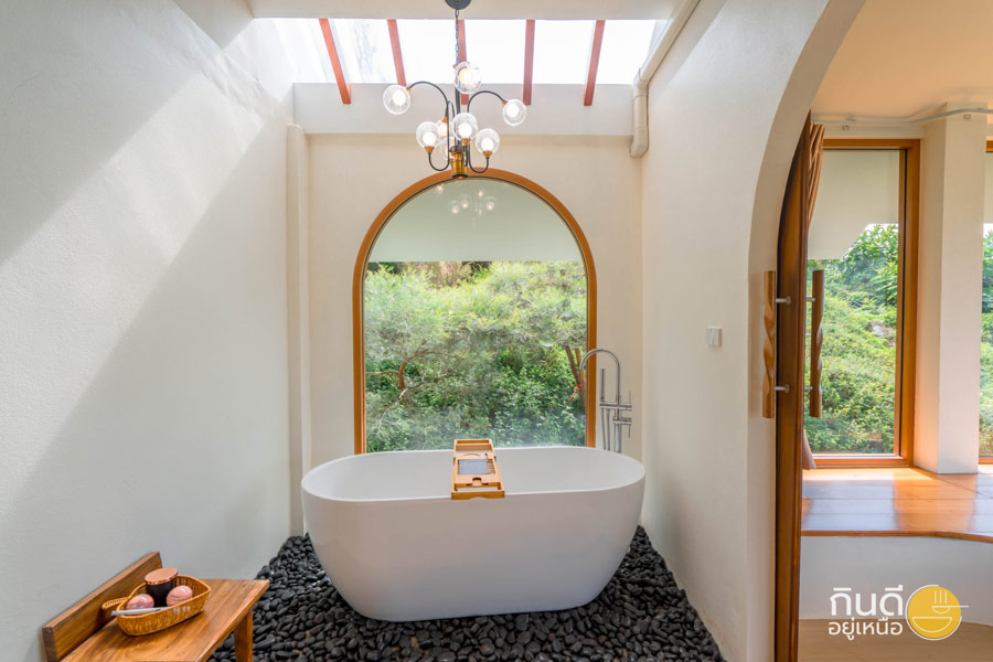 ในส่วนของห้องน้ำและห้องอาบน้ำแยกสัดส่วนได้เป็นระเบียบสุดๆ ตรงมุมอ่างจากุชชี่มีกระจกใสทรงโค้งให้มองวิวสวนกันเพลินๆ แถมมีบาธบอมบ์ให้พร้อมแช่ผ่อนคลายอีกด้วยนะ