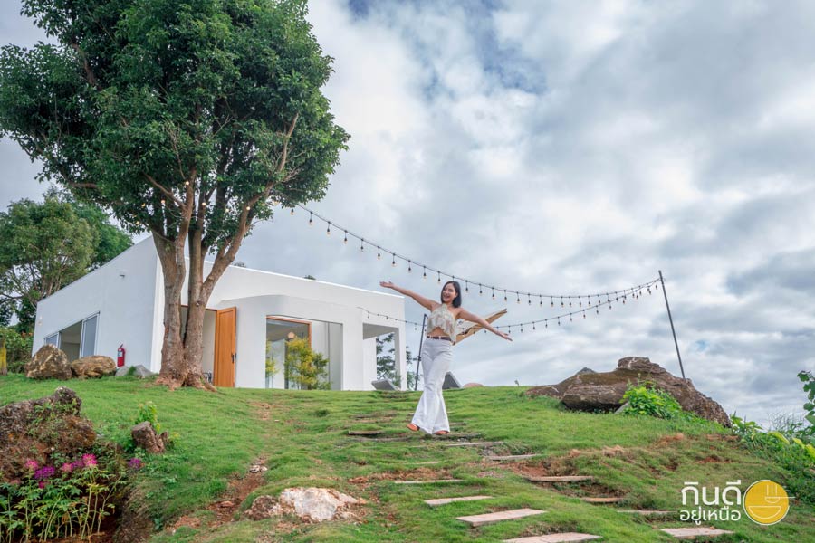 แถมยังมีสนามหญ้าหน้าบ้าน พร้อมพร็อพเก๋ๆ สำหรับถ่ายรูปทำคอนเท็นต์ด้วยนะ หรือใครจะนั่งชมวิวพระอาทิตย์ตกก็เลิศเลยล่ะ