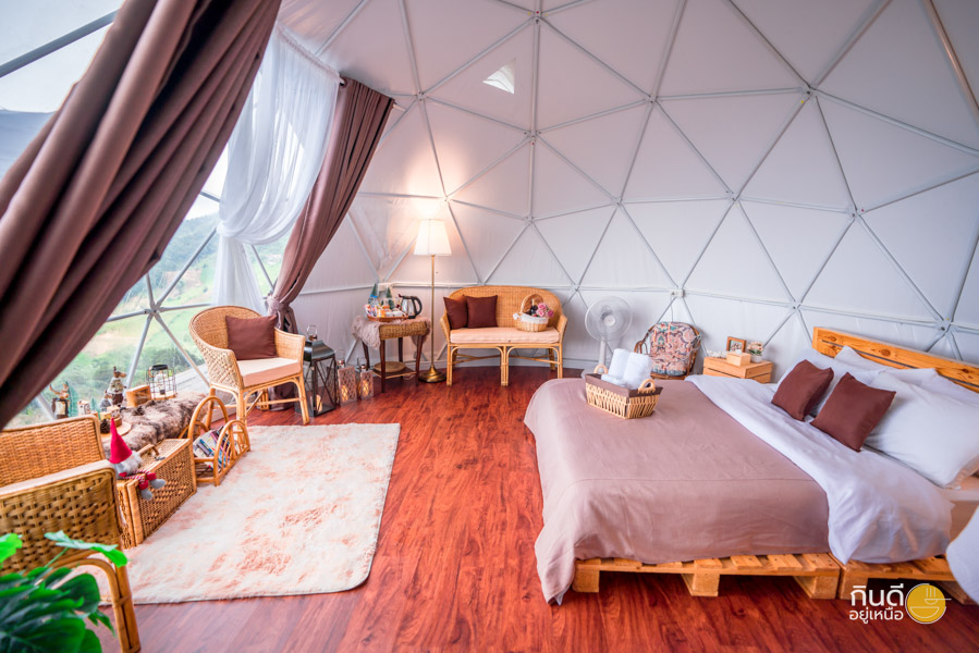 ถัดมาคือ CAMP Phuchifa ที่พักวิวอลัง บนเนินเขาภูชี้ฟ้า ที่โอบล้อมด้วยขุนเขาและสายหมอก เหมาะกับคนที่อยากหนีเมืองมานอนให้ธรรมชาติบำบัด เต็นท์ที่นี่เป็นแบบ โดมใส มีเพียง 6 หลังเท่านั้น ตั้งลดหลั่นตามแนวเขา ทำให้ทุกหลังเห็นวิวเต็มๆ ส่วนภายในตกแต่งอย่างอบอุ่น มีเตียงใหญ่ พื้นที่นั่งเล่น และห้องน้ำแยกส่วนชัดเจน บรรยากาศเงียบสงบ มีเพียงเสียงลมกับเสียงป่า ยิ่งถ้าใครมาช่วงปลายฝนต้นหนาว อากาศเย็น หมอกฟุ้ง บรรยากาศคือดีจนอแทบไม่อยากกลับเลย!