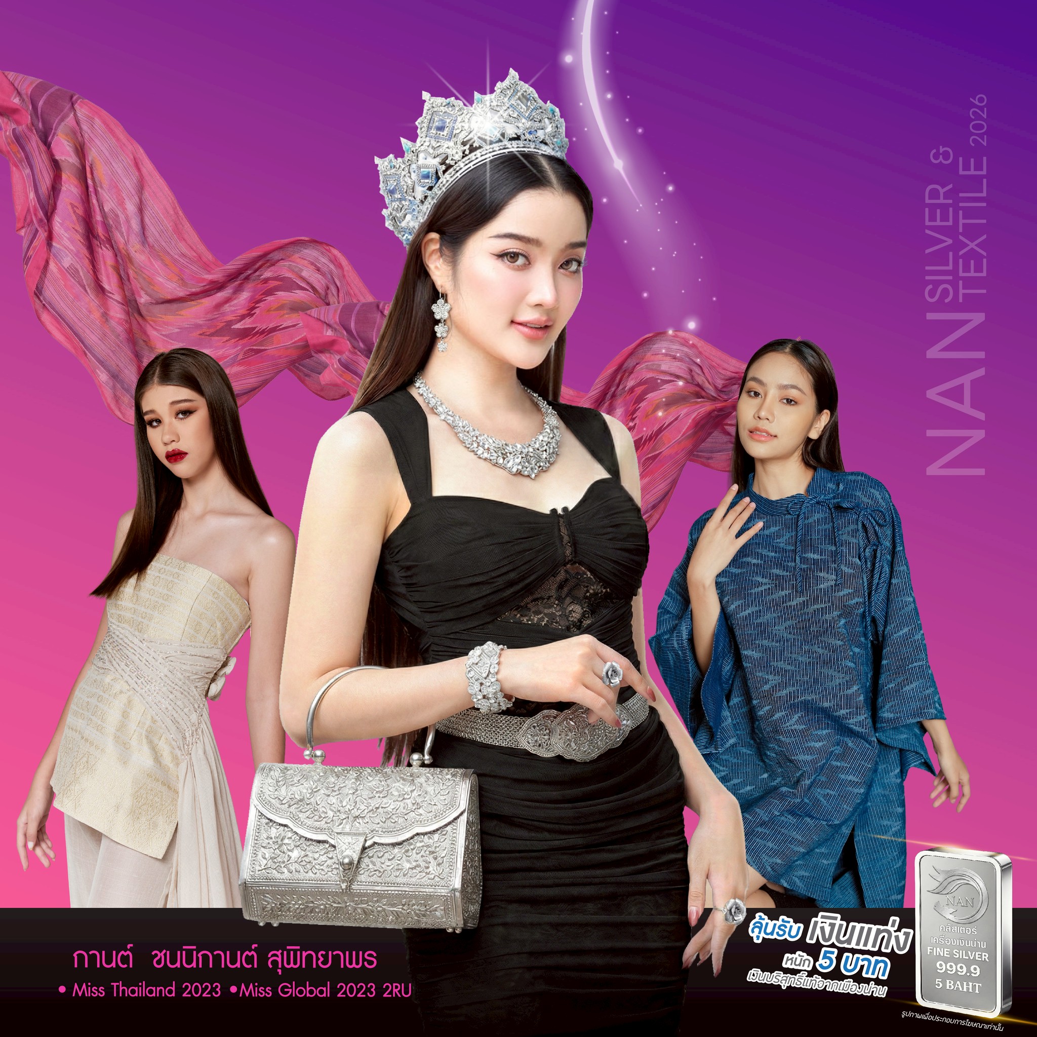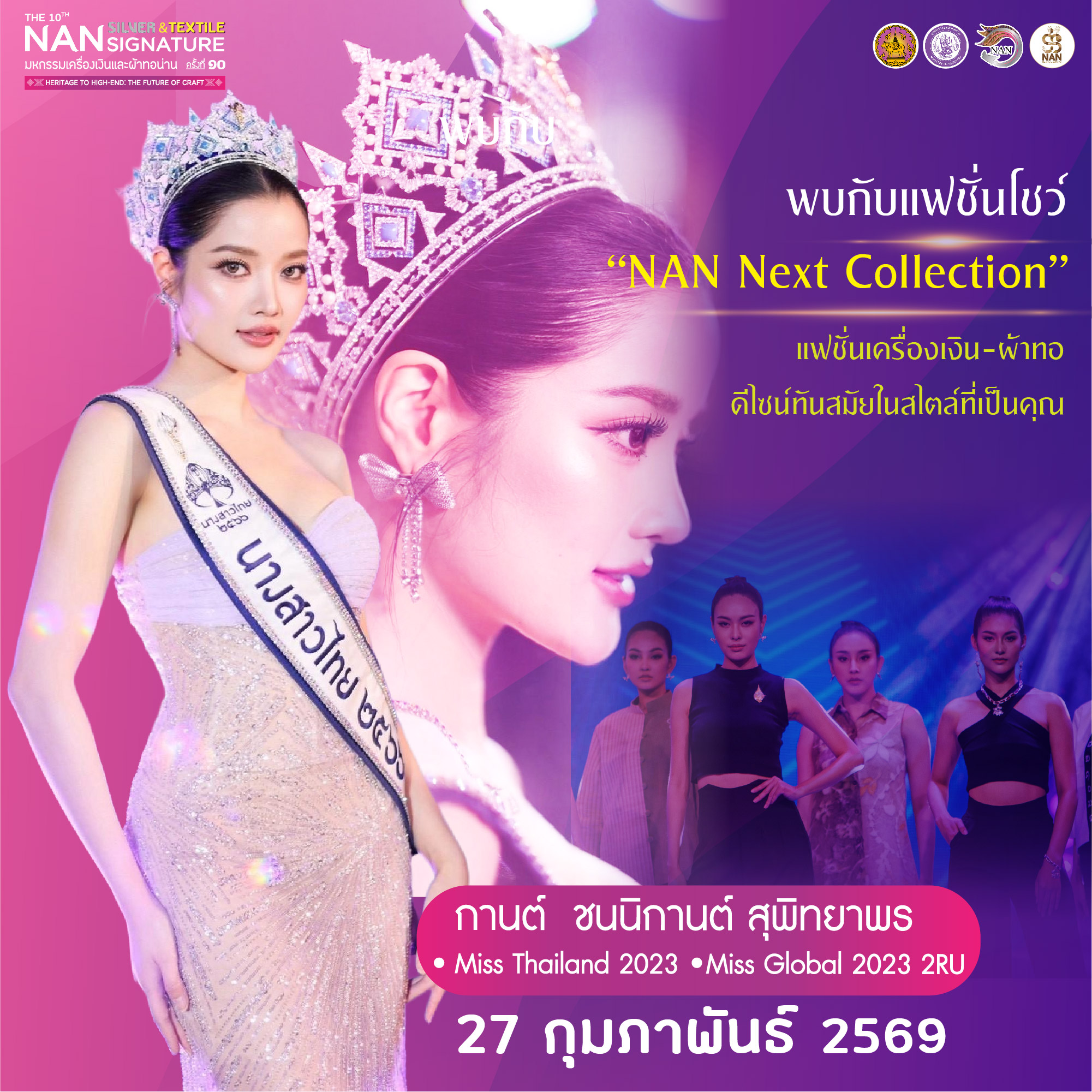 1. แฟชั่นโชว์สุดตระการตา: ชมแฟชั่นโชว์อันงดงาม นำทีมโดย กานต์ Miss Thailand 2023 และรองอันดับ 2 Miss Global 2023 ที่จะนำเสนความสวยงามของเครื่องเงินและผ้าทอน่านบนเวทีระดับประเทศ