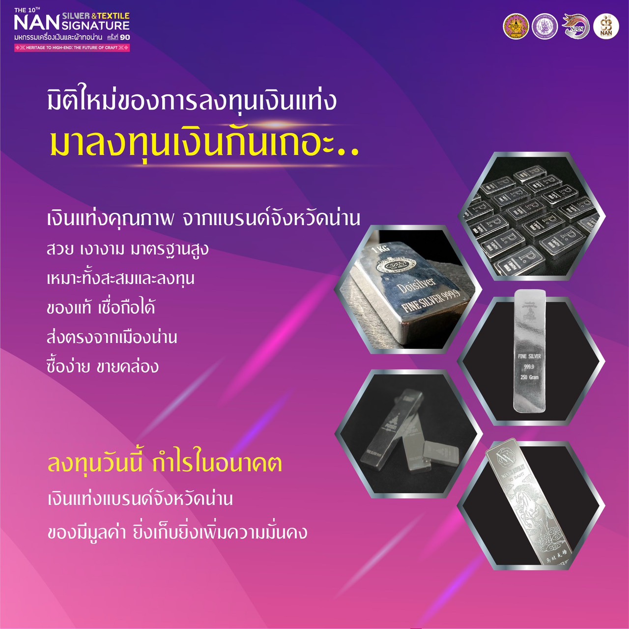 ขอเชิญชวนทุกท่านร่วมสัมผัสประสบการณ์การช้อปปิ้ง ชมการแสดง และลุ้นรับรางวัลในงานมหกรรมเครื่องเงินและผ้าทอน่าน ครั้งที่ 10 รับรองว่าท่านจะได้รับความประทับใจกลับไปอย่างแน่นอน