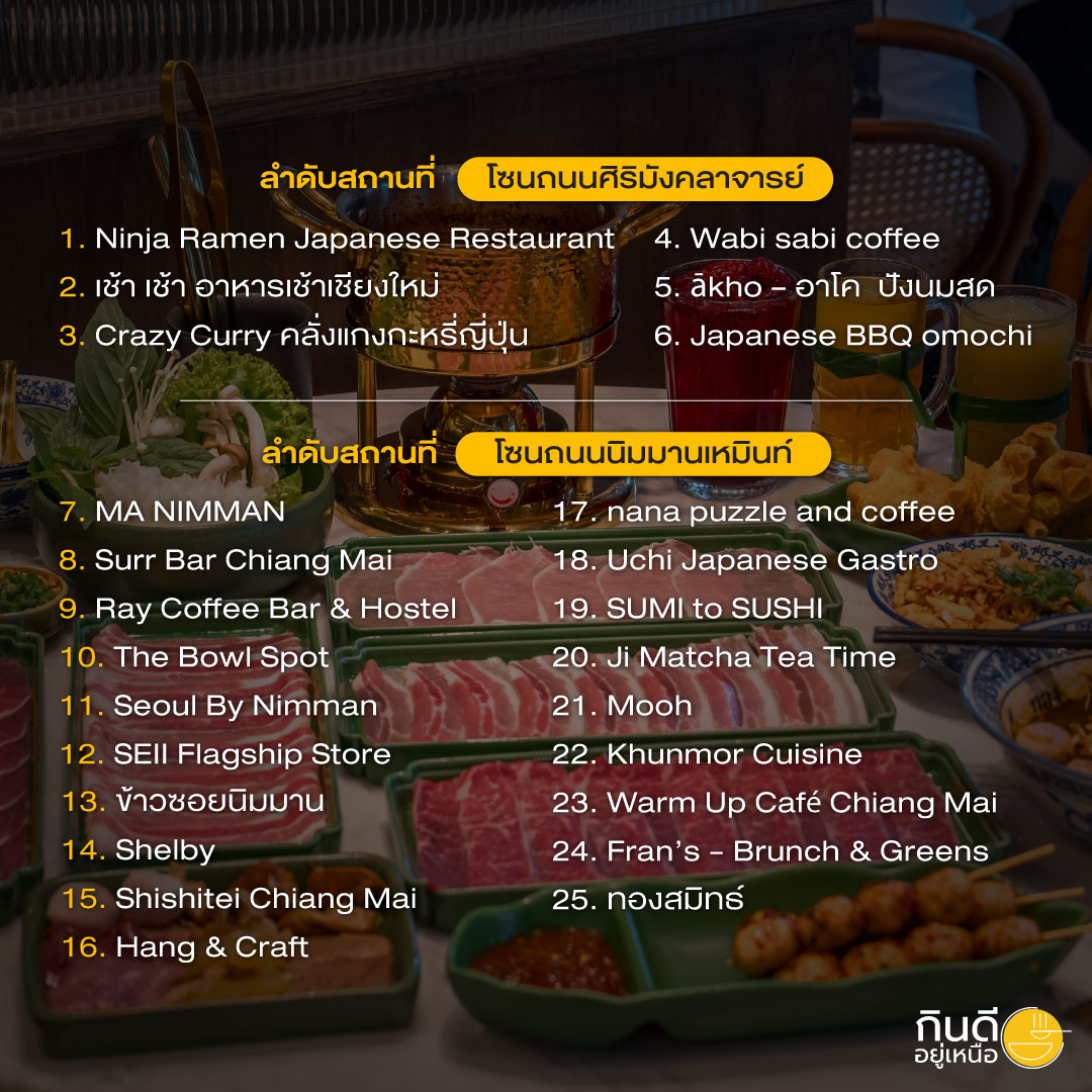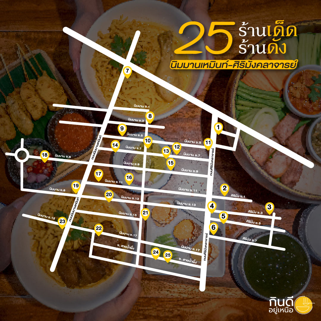 วันนี้ กินดีอยู่เหนือ จะพาทุกคนไปบุกย่านที่ฮิตที่สุดในเชียงใหม่อย่าง นิมมานเหมินท์ – ศิริมังคลาจารย์ ย่านนี้บอกเลยว่าเดินไปทางไหนก็เจอแต่ของอร่อยและมุมถ่ายรูปปังๆ จัดเต็มคัดเน้นๆ มาให้ถึง 25 ร้าน เรียงพิกัดตามซอยมาให้เดินตามได้ง่ายๆ ใครสายกิน สายคาเฟ่ หรือสายตี้ เตรียมเซฟโพสต์นี้ไว้เลย รับรองว่าอิ่มฟินเช้าจรดค่ำแน่นอน พร้อมแล้วไปลุยกันเลย